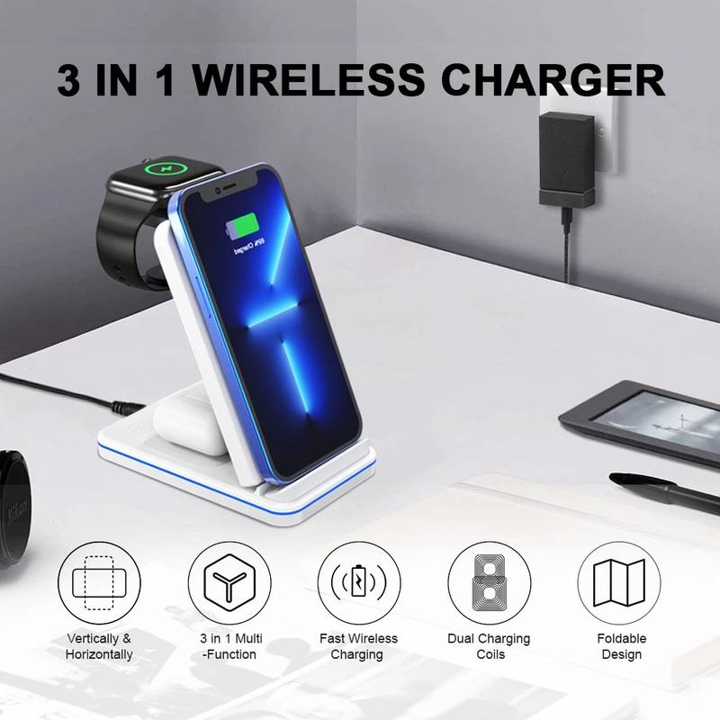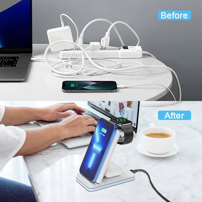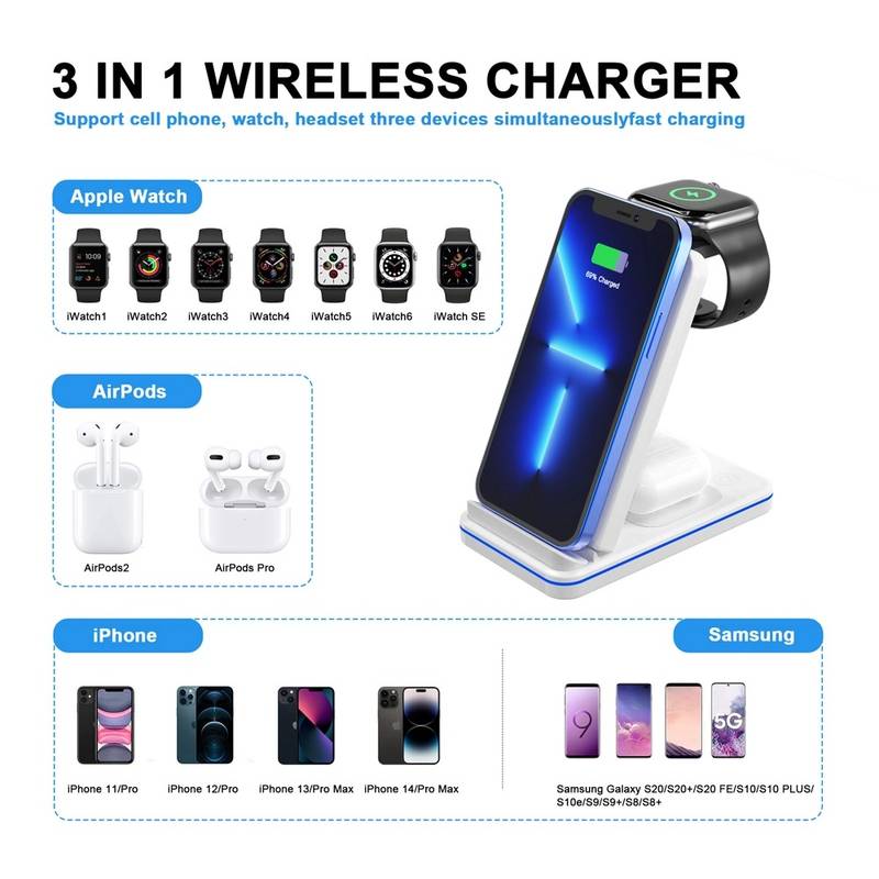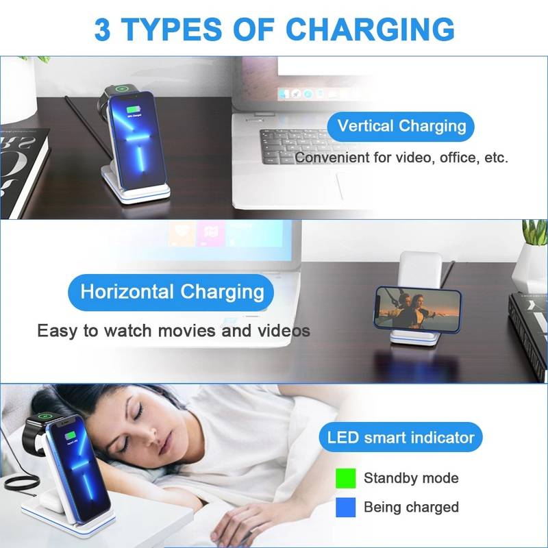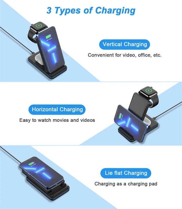 Phone charging part can be adjusted height as a phone stand, can also be completely folded flat, convenient storage, travel and tourism to carry. The headset charging part can also charge the phone, is a wireless charger that can charge two phones at the same time, dual coil design folding the phone is also very fast.