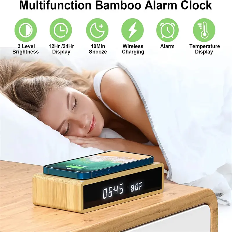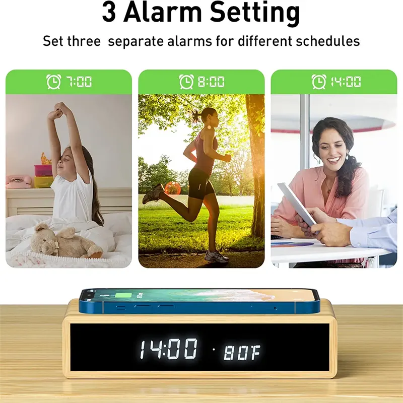 Wooden Led Alarm Clock Wireless Charger Charging Led Usb Electronic Desk Digital Alarm Clock