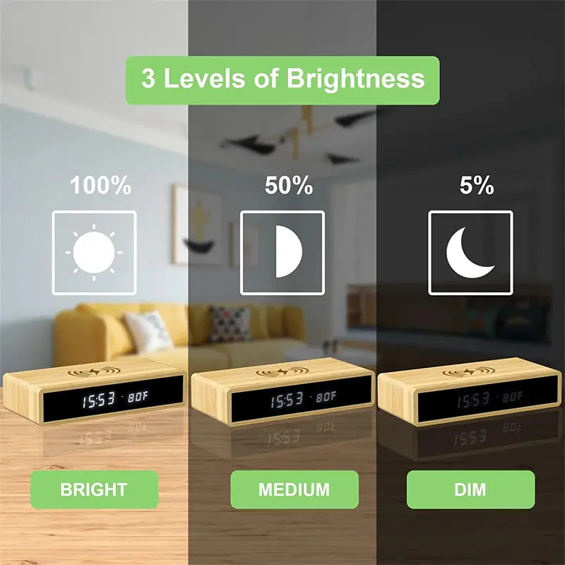 Function: 3 levels brightness/12Hr (24Hr) display/10Min Snooze/Wireless charging/ alarm/temperature display